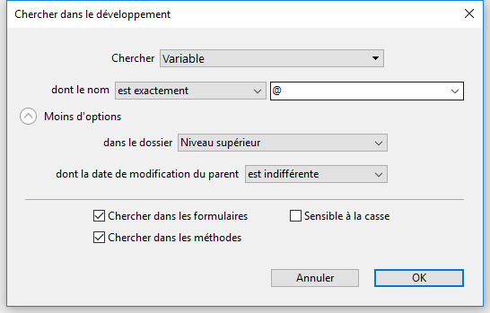Le texte : dans ce cas, 4D recherchera simplement une chaîne de caractères parmi la totalité du développement. La recherche est effectuée en mode texte brut, sans tenir compte du contexte. Par exemple, vous pouvez rechercher le texte "ALERTE("Erreur numéro :"+" ou "bouton27" Dans ce mode, il n’est pas possible d’utiliser de caractère joker. Le "@" est considéré comme un caractère standard.