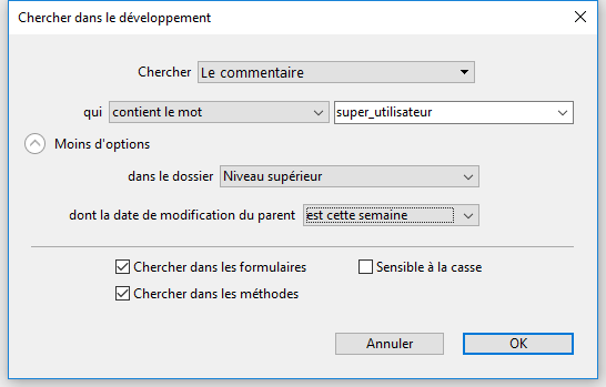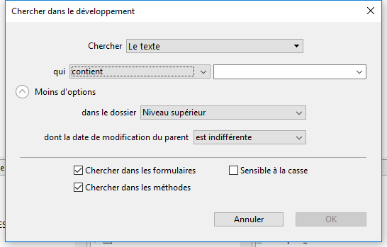 N'importe quel objet : cette option permet d’effectuer une recherche parmi tous les objets du mode Développement. Dans ce cas, seul le menu de date de modification est disponible. Typiquement, cette option permet par exemple de rechercher "tout objet modifié aujourd’hui".