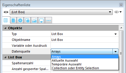 Für Listboxen vom Typ Collection oder Entity-Selection gibt es drei Eigenschaften.