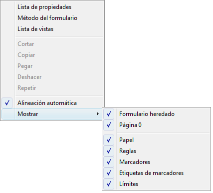 • Página 0: muestra u oculta los objetos de la página 0 en la página actual del formulario. Esta opción permite diferenciar entre los objetos de la página actual del formulario y los de la página 0. Para mayor información, consulte la sección Crear un formulario multipáginas.
