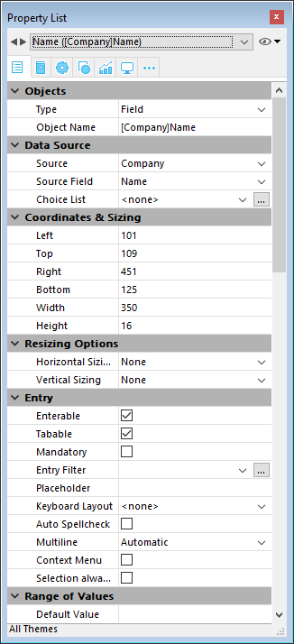 La visualización es contextual: sólo se muestran los temas y propiedades significativos para el tipo de objeto seleccionado. La visualización de algunas propiedades también cambia dinámicamente según el valor de otras propiedades. Por ejemplo, la propiedad Tabulable para un campo sólo aparece disponible si se ha definido la propiedad Editable.