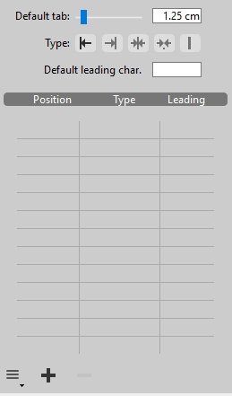 This panel manages tab stops and leading characters for paragraphs in the 4D Write Pro area. Any Indentation value set, either using the slider or by entering a value directly in the area, is used by default as the offset distance between any subsequent tabs added. When you choose a Type using one of the buttons, this type is applied to all existing tab stops for the paragraph.