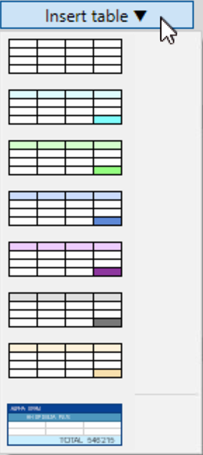 In Insert table you can choose between one of the proposed template tables and modify it using the properties menu, or choose the Wizard table that appears at the end of the list to further simplify the table creation process. See the Table Wizard documentation for more details.
