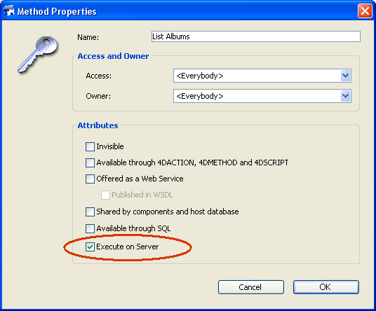 O atributo do método de projeto "Execute on Server" pode ser definido na seguinte caixa de diálogo de modificação global dos atributos ou na caixa de diálogo das propriedades do método: