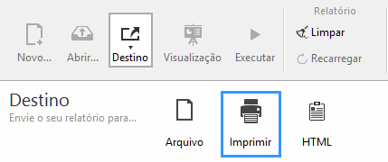 A janela de seleção de destino aparece onde puder escolher uma das opções abaixo Arquivo, Imprimir, ou HTML.