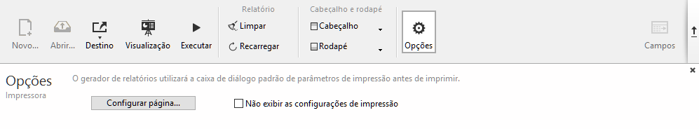 Don't display print setting: Se esta opção estiver marcada, quando clicar no botão Executar, o relatório é impresso na impressora atual sem que a caixa de configurações de impressão seja exibida