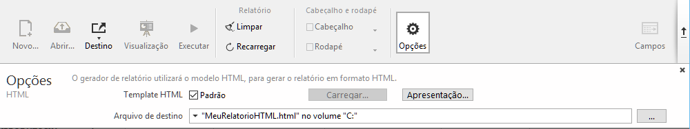 Quando o destino de relatório for estabelecido como "HTML", as opções abaixo estão disponíveis: