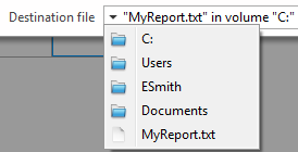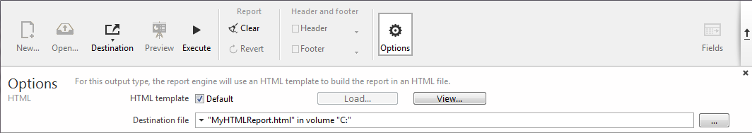 • 出力先ファイル: 生成されるファイルのファイル名と出力先を設定するのに使用します。入力した名前とファイル位置は、レポート実行時にデフォルトで提示されます。