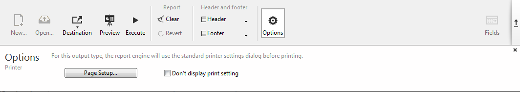 • 印刷設定を表示しない: このオプションがチェックされた場合、実行ボタンを押したときに、印刷設定ダイアログボックスが表示される事なく、レポートはカレントのプリンター上で表示されます。