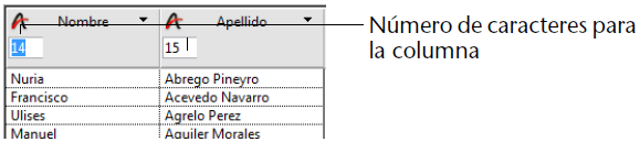 Modificar la longitud de los campos de longitud fija Si elige el formato texto de longitud fija, el área de vista previa indica el número de caracteres para cada columna. Puede redimensionar cada columna arrastrando el separador de columnas en la barra de título con el ratón. Si está utilizando el formato texto de longitud fija, cambia el número de caracteres destinado a la columna en el archivo a exportar. Puede definir el número de caracteres introduciendo un valor en el área de entrada ubicada bajo el icono de tipo de dato de los campos. El número de caracteres por defecto es: los campos de texto tienen una longitud de 80 caracteres, los campos Alfa tienen una longitud máxima asignada en el entorno Diseño y los campos numéricos tienen una longitud de 10 caracteres.
