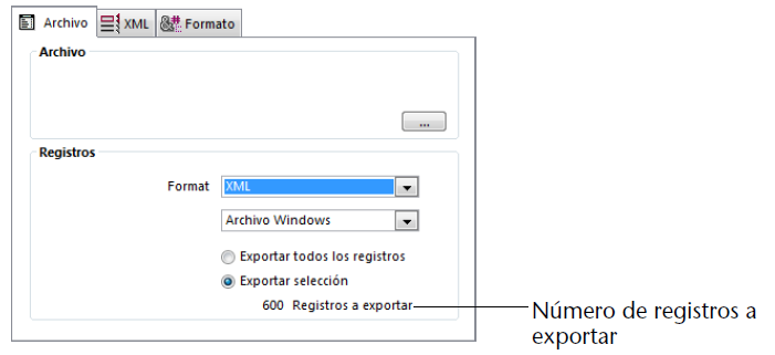 En el área “Registros”, seleccione el formato del archivo de exportación, Texto, Texto de longitud fija, DIFF, SYLK, DBF, 4D o XML y sus opciones de formato (ver la sección Formatos de archivos).