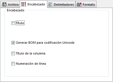 Generar BOM para codificación Unicode: inserta en el encabezado del archivo de exportación un Byte Order Mark (BOM). Esta información adicional facilita la interpretación del texto por el software de importación, si soporta esta función. Esta opción está seleccionada por defecto pero sólo se tiene en cuenta cuando el carácter Unicode está seleccionado para la exportación. Si este no es el caso, no se añade el BOM.