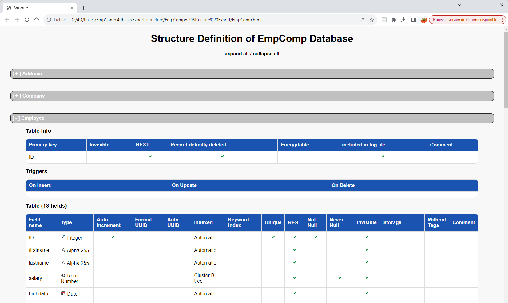 4D lets you export the database structure definition as an XML or HTML file. Conversely, it is possible to use a structure definition saved in XML format to generate a new 4D database on the fly. These possibilities meet different needs: