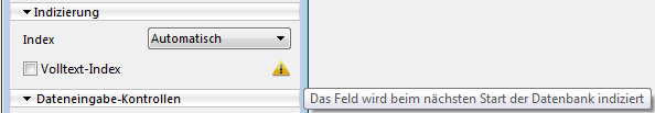 Wählen Sie für ein Feld die Eigenschaft Einmalig, zeigt ein Icon im Inspektorfenster an, dass ein Index erstellt wird (falls noch keiner existiert):