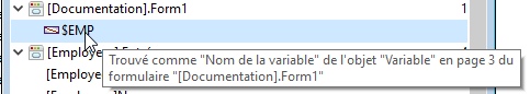 Vous pouvez faire apparaître une infobulle pour chaque élément afin d'obtenir des informations supplémentaires, par exemple la propriété de l'élément correspondant à la recherche ou le numéro de page du formulaire contenant l'occurrence :