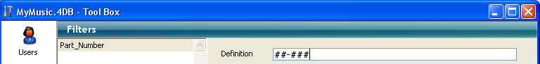 - Or, for another example, if you wanted to create a Part Number entry filter for a part number with the format XA-654-1, you would use the following filter: