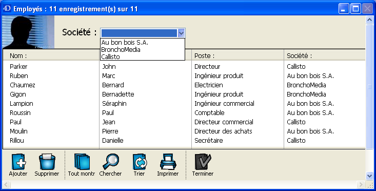 Les boutons de contrôle ont été placés dans la zone de pied de page. Une image personnalisée est placée dans la zone d’en-tête. La zone d’en-tête comporte également une liste déroulante permettant de sélectionner la société dont on souhaite visualiser les employés.