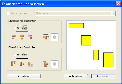 Wenn Sie Objekte untereinander ausrichten, können Sie diese oben, unten, seitlich, horizontal mittig oder vertikal mittig ausrichten. Sie können eine Objektauswahl direkt ausrichten oder ein Dialogfenster verwenden, in dem Sie sowohl die Ausrichtung als auch die Verteilung der Objekte definieren können. Hier können Sie auch das Ausgangsobjekt bestimmen, nach dem die anderen Objekte ausgerichtet werden sollen. Eine Vorschau zeigt das Ergebnis Ihrer Einstellungen.