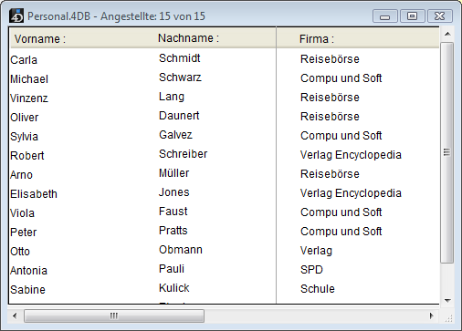 Die Tabelle [Angestellte] enthält einen Datensatz pro Angestellten. Die Tabelle [Firma] enthält einen Datensatz pro Firma. Die Verknüpfung zwischen den beiden Tabellen ermöglicht Ihnen, auf Informationen aus beiden Tabellen zuzugreifen, Informationen einzugeben, zu ändern oder zu löschen. Zum Beispiel: