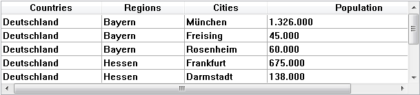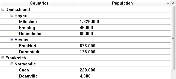 Wird ein Formular mit hierarchischer Listbox zum ersten Mal geöffnet, werden standardmäßig alle Zeilen aufgeklappt. Ein Umbruch und ein hierarchischer Knotenpunkt werden automatisch in der Listbox hinzugefügt, wenn Werte in den Arrays wiederholt werden. Nehmen wir z.B. eine Listbox mit vier Arrays mit den Spalten "Countries", "Regions", "Cities" und "Population":