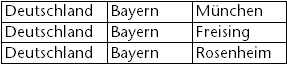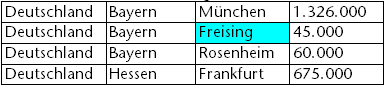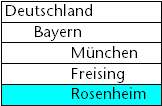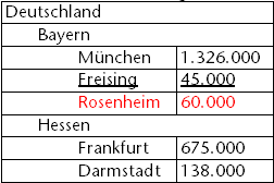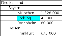 Beim Anzeigen in hierarchischer Form erscheint der Eintrag "Freising" nicht in der zweiten, sonderen in der vierten Zeile, weil zwei Umbruchzeilen hinzugefügt werden: