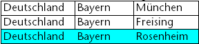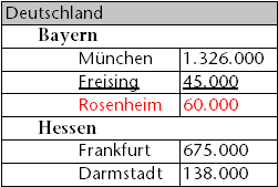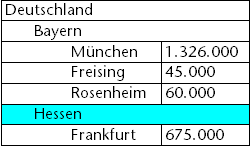 Sind alle Zeilen einer Unterhierarchie ausgeblendet, wird die Umbruchzeile ebenfalls ausgeblendet. Werden zum Beispiel unter Deutschland die Zeilen 1 bis 3 ausgeblendet, erscheint die Umbruchzeile "Bayern" nicht.