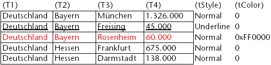 Unabhängig von der Darstellung der Daten in der Listbox (hierarchisch oder nicht), wollen Sie die Zeile mit "Freising" in Fettschrift setzen, müssen Sie die Anweisung Stil{2} = bold schreiben. Denn es wird nur die Position der Zeile in den Arrays berücksichtigt.