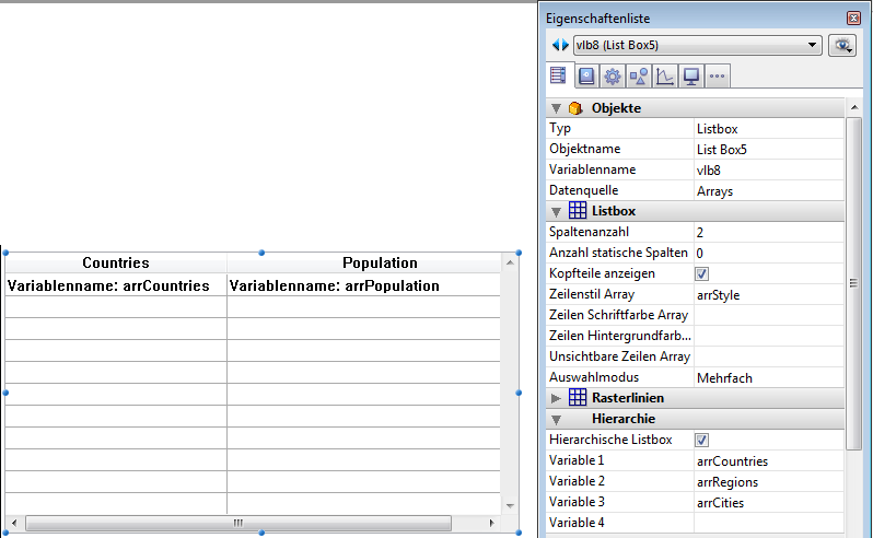 In der Eigenschaftenliste ist die Option "Hierarchische Listbox" ist für das Objekt markiert.