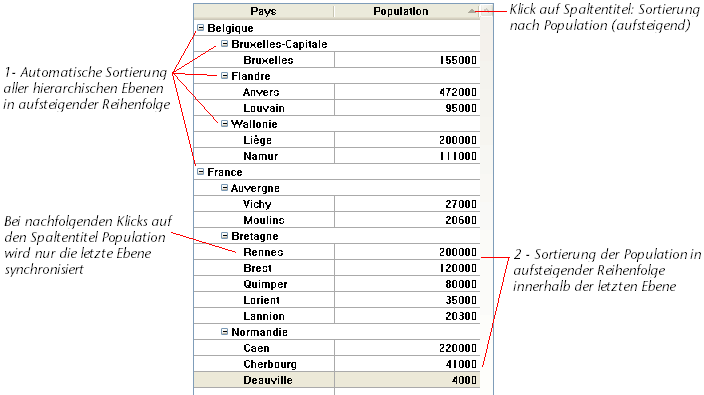 Bei einer Listbox im hierarchischen Modus wird die Standardsortierung, d.h. wenn Sie auf den Titel einer Spalte der Listbox klicken, immer wie folgt aufgebaut: