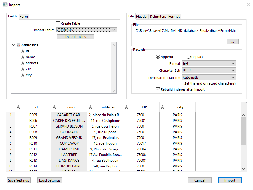 Rebuild indexes after import: When this option is checked (by default), the indexes of the fields into which data is imported are rebuilt after the import. This mechanism can accelerate imports of large volumes of data. If the import concerns a quantity of data that is smaller than that already contained in the field, it may be useful to deselect this option before the import. In this case, the index is updated gradually and not rebuilt in its entirety.