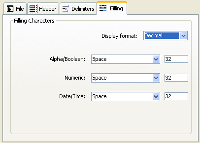 Different fill characters can be used for three data types: Alpha/Boolean (Boolean fields are imported as alphas), Numeric and Date/Time. Normally, the space is used to pad fixed format fields. The drop-down lists contain other choices. The entry areas to the right display the selected fill character. If you wish to use other characters, enter them directly in the entry areas.