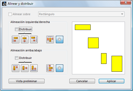 Nota: esta caja de diálogo combina la alineación de objetos y su distribución en una operación. Para mayor información sobre cómo distribuir objetos, consulte el párrafo Distribuir objetos.