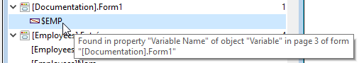 •  propriedade  (se for pertinente): designa a propriedade de objeto que coincide com os criterios de pesquisa. Por exemplo, uma string poderia ser encontrada em um nome de variàvel (propiedade de variàvel) e um nome de objeto (propriedade nome) em um elemento formulário. Este campo está vazío quando o elemento correspondente for o próprio objeto.
