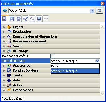 Minimum et Maximum : valeurs minimale et maximale de la jauge. Dans le cas d'un stepper numérique, ces propriétés représentent des secondes si l'objet est associé à une valeur de type heure et sont ignorées s'il est associé à une valeur de type date.