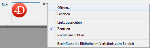 Das Bild wird standardmäßig in der Mitte des Kopfteils bzw. Fußteils eingesetzt. Über das lokale Menü können Sie die Ausrichtung verändern (Links ausrichten, Zentriert, Rechts ausrichten):