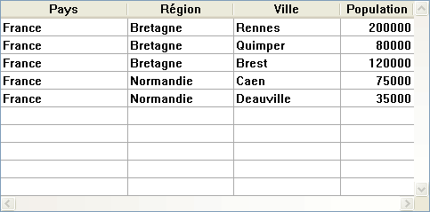 Une ligne de rupture et un "noeud" hiérarchique sont automatiquement ajoutés dans la list box lorsque des valeurs sont répétées dans les tableaux. Par exemple, imaginons une list box contenant quatre tableaux définissant des villes, chaque ville étant caractérisée par un pays, une région, un nom et un nombre d’habitants :
