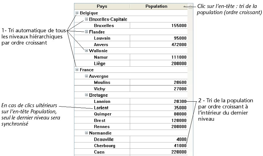 Dans une list box en mode hiérarchique, un tri standard (effectué suite à un clic dans un en-tête de colonne de la list box) est toujours construit de la manière suivante :