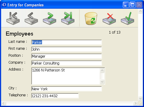 4D offers three standard actions to meet the basic needs for managing subrecords: Edit Subrecord, Delete Subrecord, and Add Subrecord. When the form includes several subform instances, the action will apply to the subform that has the focus.