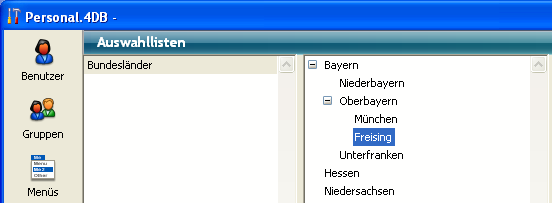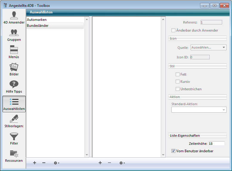 Klicken Sie unter den Auswahllisten auf das Pluszeichen ODER Klicken Sie mit der rechten Maustaste in die Auswahllisten und wählen im Kontextmenü den Eintrag Neu. 4D erzeugt im Bereich Auswahllisten ein neues Element mit Namen Neue Liste N. Hinweis: Gibt es bereits eine Auswahlliste im linken Bereich, ist im Kontextmenü der Befehl Duplizieren verfügbar. Damit können Sie rasch eine neue Auswahlliste mit den Eigenschaften der bereits bestehenden Liste erzeugen.