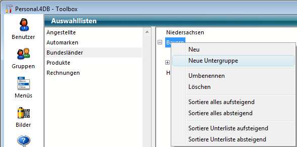 Wählen Sie im DropDown-Menü unter der mittleren Liste oder im Kontextmenü den Eintrag Neue Untergruppe.