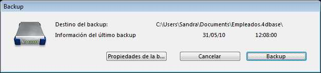El botón Propiedades de la base abre el tema “Backup” de las Propiedades de la base, permitiéndole visualizar, y si es necesario, modificar los parámetros del backup actual.