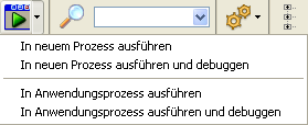 Jedes Fenster des Methodeneditors hat oben links ein Icon mit grünem Pfeil, um die aktuelle Methode auszuführen. Über das zu geordnete PopUp-Menü können Sie zwischen verschiedenen Arten wählen: