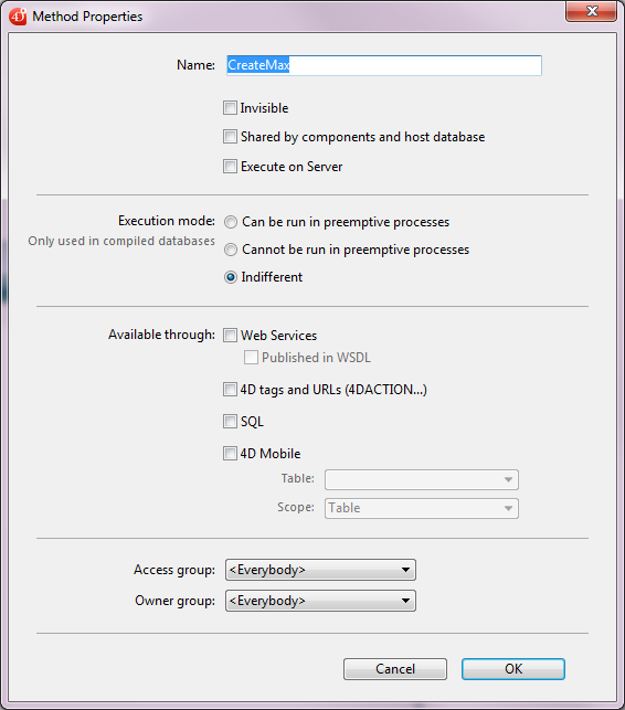 The Batch setting of attributes... command of the context menu or options menu (applied to project methods only) is used to modify an attribute (Invisible, Available through 4D HTML tags and URLS (4DACTION...), etc.) for all or part of the database project methods in a single operation. For more information about this command, refer to the Batch setting for method attributes paragraph.