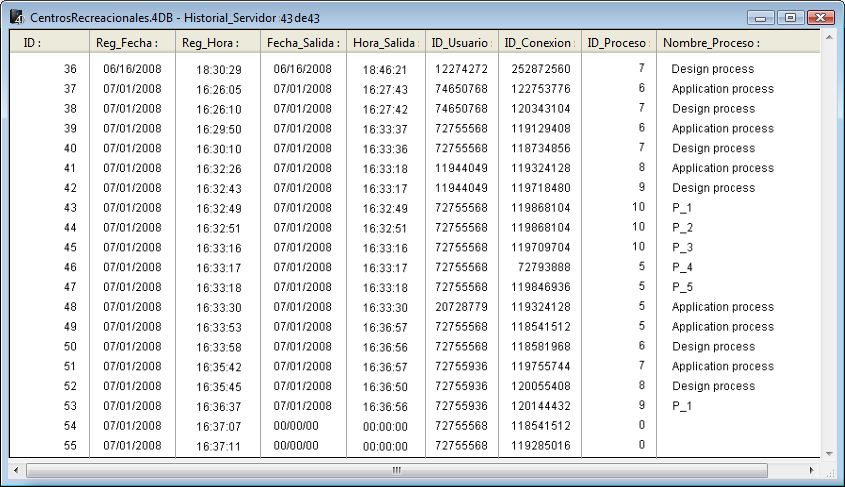 Estos números de referencia no son utilizables directamente como fuentes de información a pasar, por ejemplo, como parámetros a un comando 4D. Sin embargo, ofrecen una manera única de identificar un proceso 4D Client entre el Método base On Server Open Connection y el Método base On Server Close Connection. La combinación de estos valores es única en cualquier momento de una sesión 4D Server. Al guardar esta información en una tabla o en un array interproceso, los dos métodos base pueden intercambiar información. En el ejemplo al final de esta sección, los dos métodos base utilizan esta información para almacenar la fecha y hora de inicio y fin de una conexión en el mismo registro de una tabla.