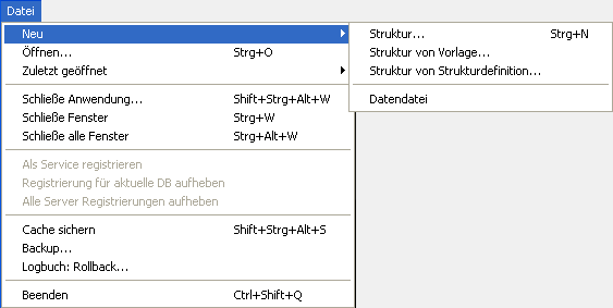 Um eine neue Datenbank zu erstellen, können Sie im Untermenü Neu zwischen drei Optionen wählen: