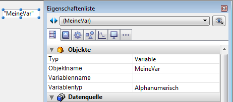 Variablen, die Formularobjekten zugeordnet sind, können jede Art von Ausdruck enthalten, der einen Wert zurückgibt. Sie können den Ausdruck direkt im Bereich Variablenname in der Eigenschaftenliste für das Objekt eingeben:
