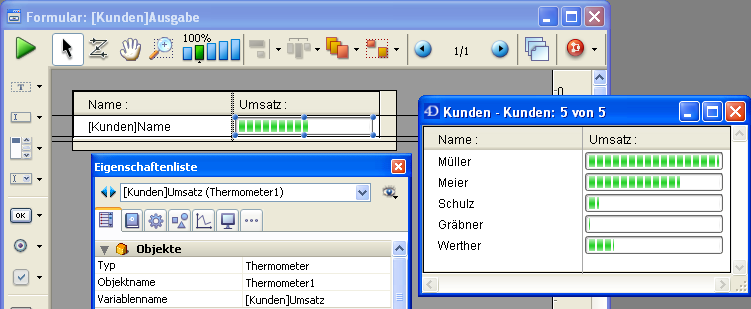 Das bietet vielfältige Möglichkeiten. Sie können z.B. einem Ablaufbalken ein Datenfeld vom Typ Zahl zuweisen, um die Werte in Listen in grafischer Form darzustellen: