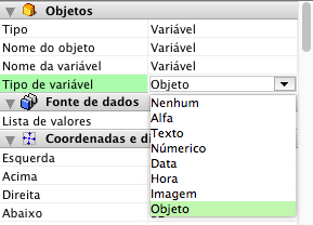 Para converter um campo em uma variável ou vice-versa, selecione o objeto e selecione Campo ou Variável da lista Tipo na Lista de propriedades, (tema “Objetos”). A Lista de propriedades é atualizada para mostrar as propriedades do novo tipo de objeto. O nome de objeto, o método de objeto e suas propriedades (tamanho, editável, etc.) são conservadas.