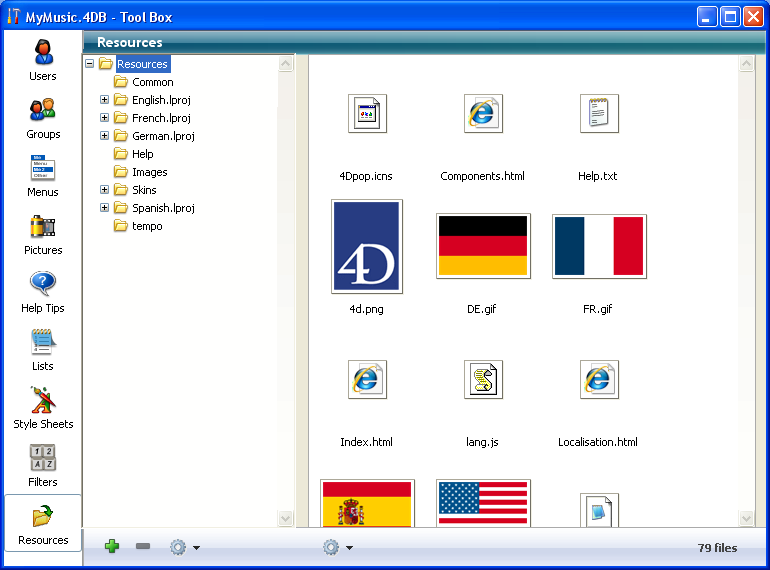 More particularly, in order to facilitate the management of this folder in a client-server architecture, 4D v11 SQL includes a new tool that can be used to manage the contents of the Resources folder: the resources explorer. This tool is found in the 4D Tool Box:
