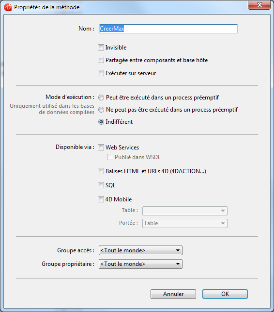 La boîte de dialogue “Propriétés de la méthode” apparaît. Elle vous permet de modifier le nom ainsi que d’autres propriétés de la méthode.